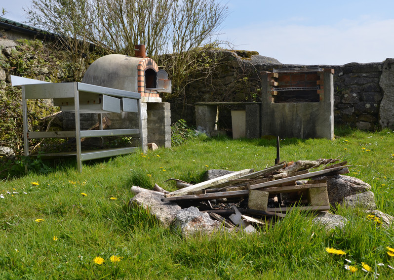 Our Outdoor Kitchen features a large BBQ, pizza oven, firepit, picnic tables and pallet seat. Perfect for enjoying the long summer evenings.
